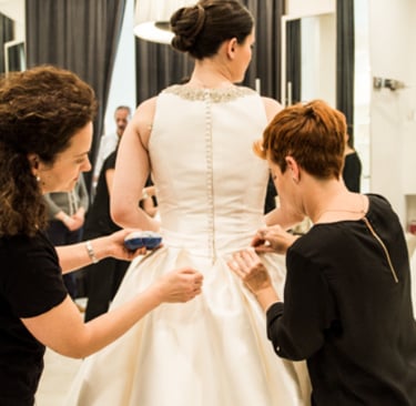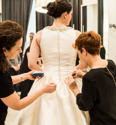 En esta etapa, nuestras modistas ponen toda su experiencia y dedicación en refinar cada línea y cada curva de tu vestido. Aquí, en el corazón de la alta costura, sucede la verdadera magia: el diseño que amas se transforma en una segunda piel que se adapta a ti con precisión.